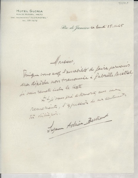 [Carta] 1945 nov. 25, Rio de Janeiro, [Brasil] [a] [Gabriela Mistral], [Brasil?] [manuscrito] Suzanne Adrien Bertrand.