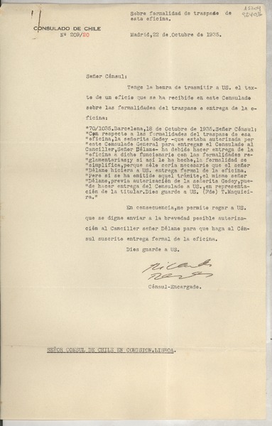 [Oficio] N° 20920, 1935 oct. 22, Madrid, [España] [al] Señor Cónsul de Chile en Comisión, Lisboa, [Portugal] [manuscrito] / Ricardo Reyes Cónsul-Encargado.