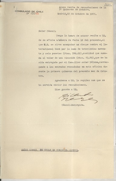 [Oficio] N° 21221, 1935 oct. 22, Madrid, [España] [al] Señor Cónsul de Chile en Comisión, Lisboa, [Portugal] [manuscrito] / Ricardo Reyes Cónsul-Encargado.