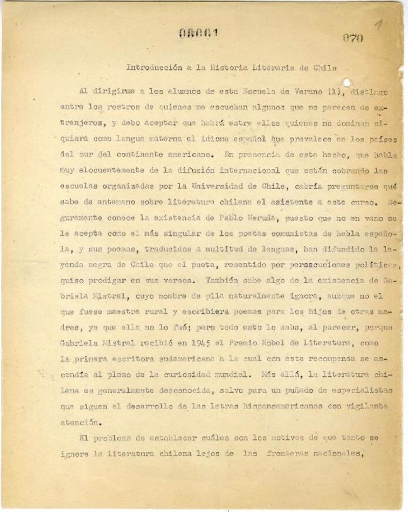 Introducción a la historia literaria de Chile [manuscrito] Raúl Silva Castro.