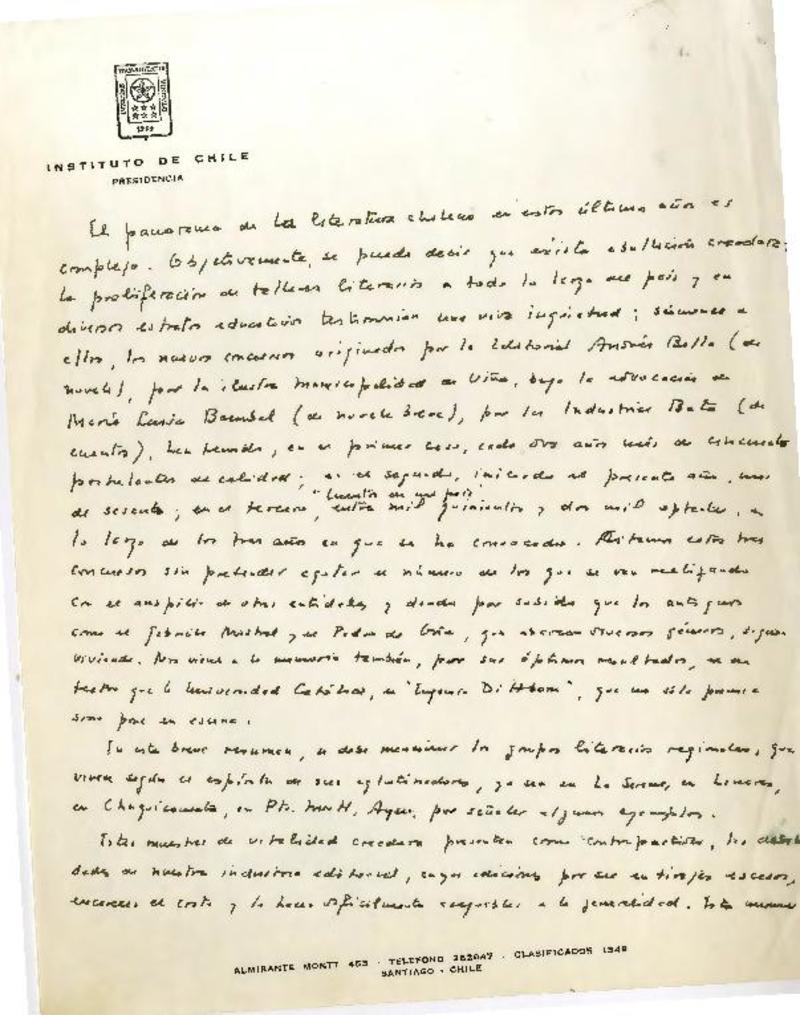[El panorama de la literatura chilena...] [manuscrito] Roque Esteban Scarpa.