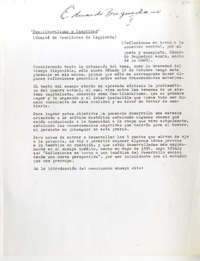 Neoliberalismo e identidad [manuscrito] Eduardo Baquedano.