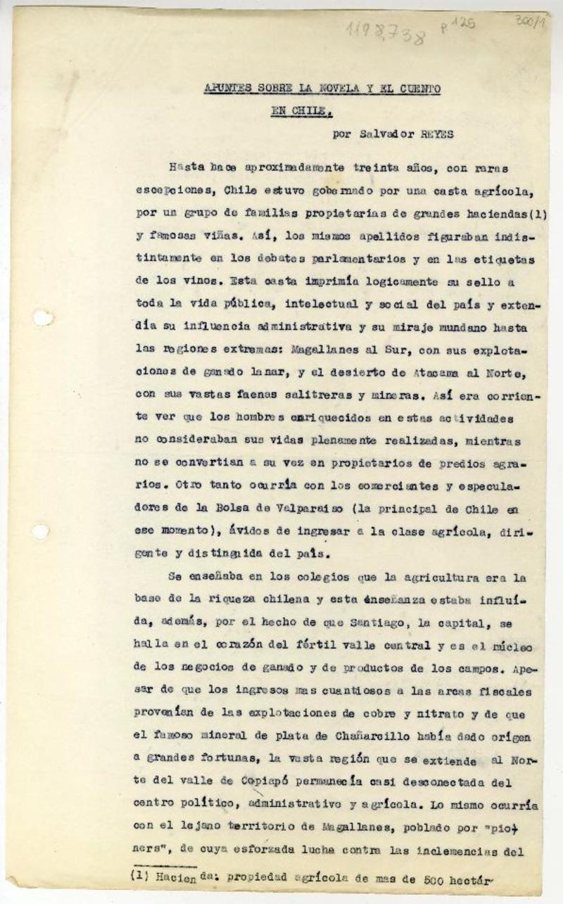 Apuntes sobre la novela y el cuento en Chile [manuscrito] Salvador Reyes.