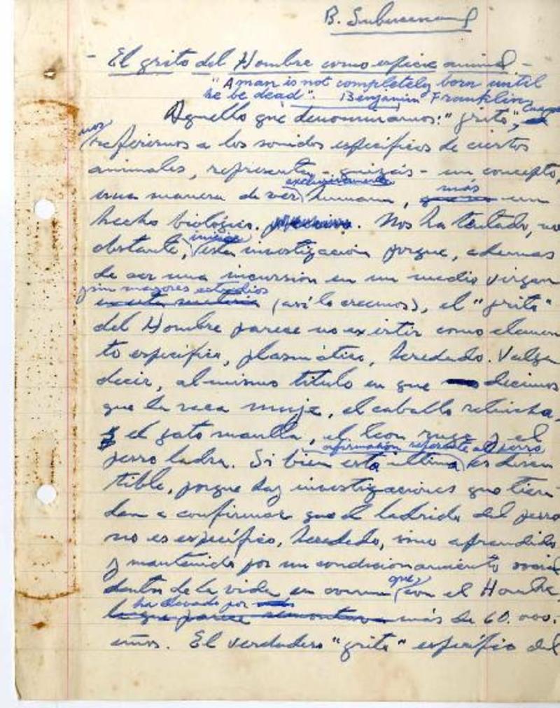 El grito del hombre como especie animal [manuscrito] Benjamín Subercaseaux.