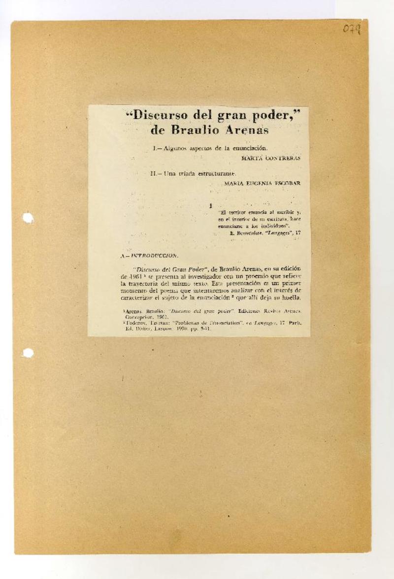 Discurso del gran poder - Ensayos - Autores chilenos - Arenas, Braulio - Literatura chilena - Manuscritos chilenos