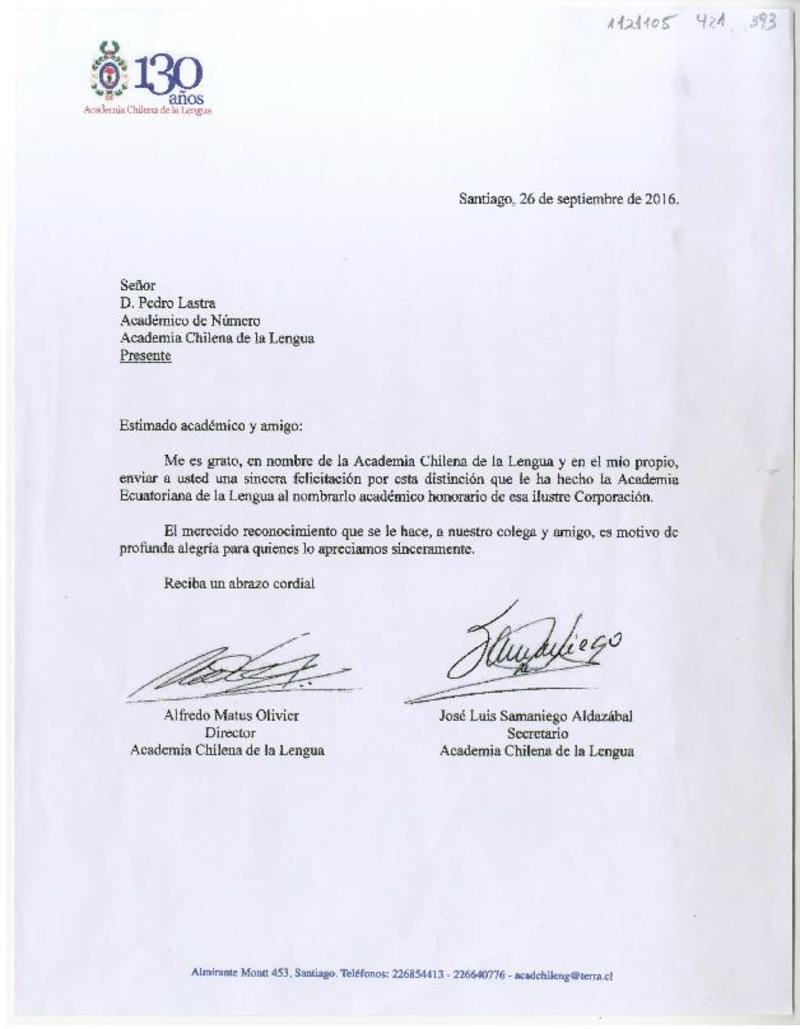 Santiago, Chile [a] Pedro Lastra Carta, 2016 septiembre 26, [manuscrito] Academia Chilena de la Lengua.