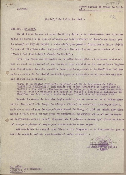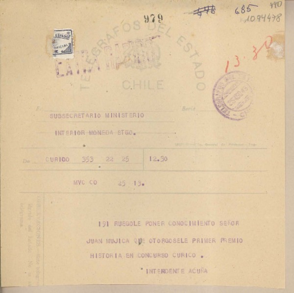 [Telegrama] 1948 agosto 25, Curico, Chile [a] Subsecretario del Ministerio del Interior, Santiago, Chile [manuscrito] Intendencia de Curico.