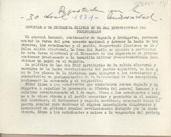 [Panfleto universitario] [manuscrito] Frente Estudiantil Revolucionario (Perú).