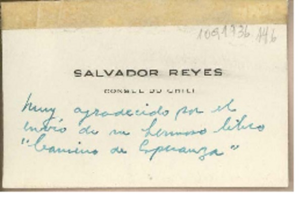 [Tarjeta] [1951], [Londres], [Inglaterra] [a] Juan Mujica de la Fuente [manuscrito] Salvador Reyes.