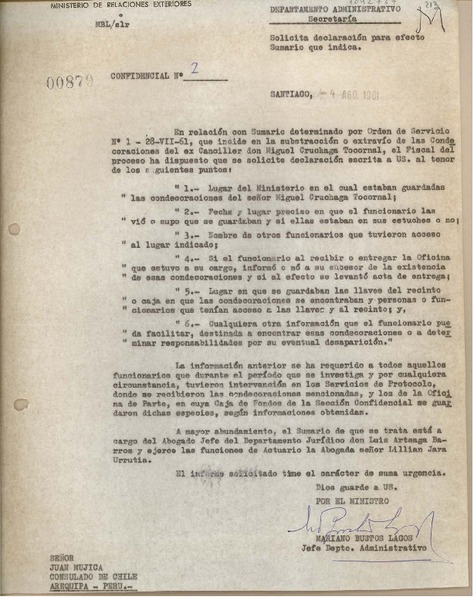 [Oficio Consular N°8792] 1961 agosto 4, Santiago, Chile [a] Juan Mujica de la Fuente, Arequipa, Perú [manuscrito] / Ministerio de Relaciones Exteriores (Chile).