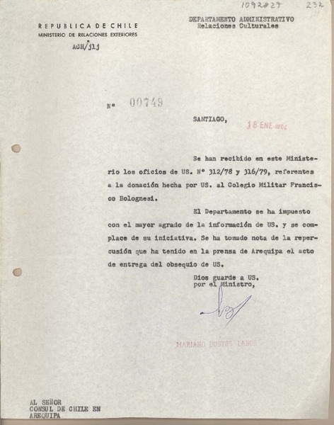 [Oficio N°00749] 1962 enero 18, Santiago, Chile [a] Juan Mujica, Arequipa, Perú [manuscrito] Mariano Bustos Lagos.