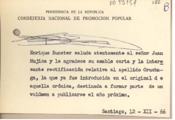 [Tarjeta] 1966 diciembre 12, Santiago, Chile [a] Juan Mujica de la Fuente [manuscrito] Enrique Bunster.