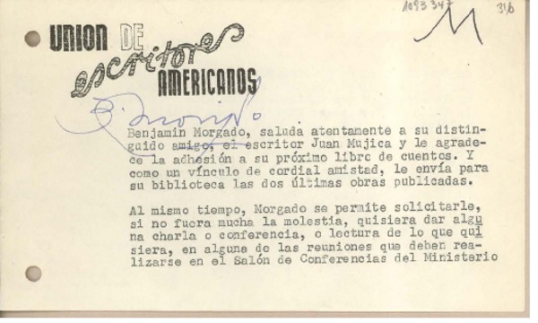 [Tarjeta] 1958 junio 1, Santiago, Chile [a] Juan Mujica [manuscrito] Benjamín Morgado.