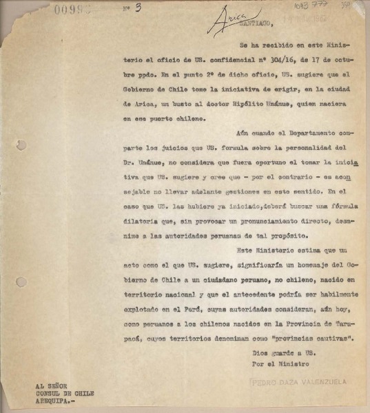 [Oficio N°9933] 1962 noviembre 14, Santiago, Chile [a] Juan Mujica, Arequipa, Perú [manuscrito] / Pedro Daza Valenzuela.