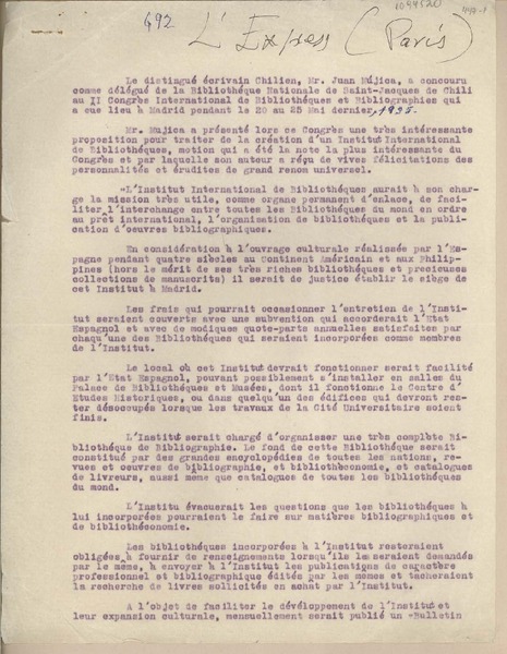 [Artículo sobre Juan Mujica] [manuscrito] L'Express (Francia)