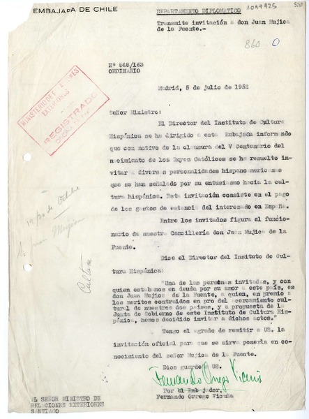 [Oficio N°848163] 1952 julio 5, Madrid, España [a] Ministro de Relaciones Exteriores, Santiago, Chile [manuscrito] / Fernando Orrego Vicuña.