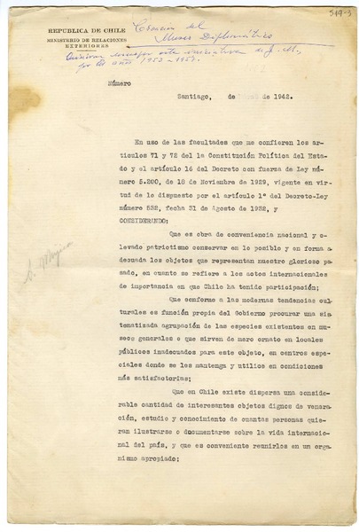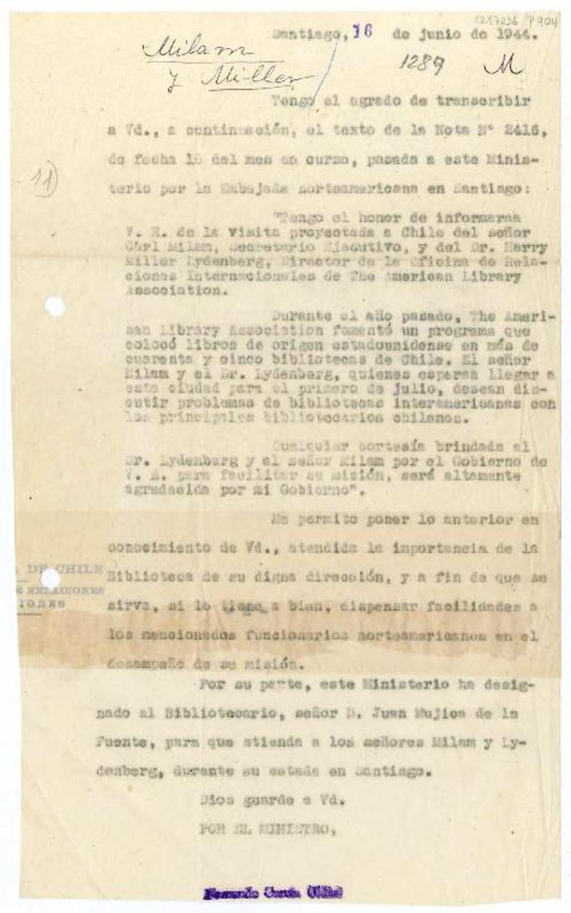 [Oficio N° 003261] 1944 junio 16, Santiago, Chile [a] [Gabriel Amunátegui Jordán] Director General de Bibliotecas y Museos [manuscrito] Fernando García Oldini.