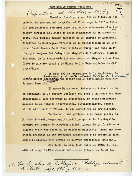[Oficio N° 25632] 1949 diciembre 9, Bilbao, España [al] Sr. Ministro de Relaciones Exteriores, Chile [manuscrito] / Juan Mujica de la Fuente.