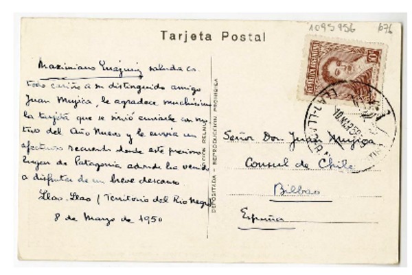 [Postal] 1950 marzo 8, Llao-Llao, Río Negro, Argentina [a] Juan Mujica, Bilbao, España [manuscrito] Maximiano Errázuriz Valdés.