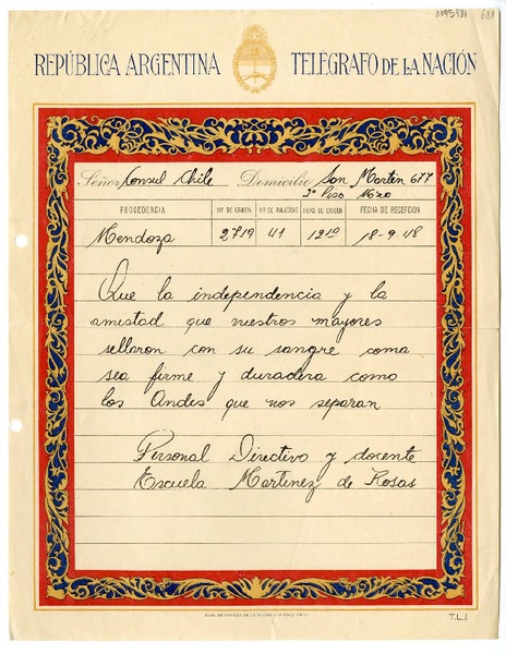 [Telegrama] 1948 septiembre 18, Mendoza, Argentina [a] Juan Mujicade la Fuente [manuscrito] Escuela Martínez de Rosas.