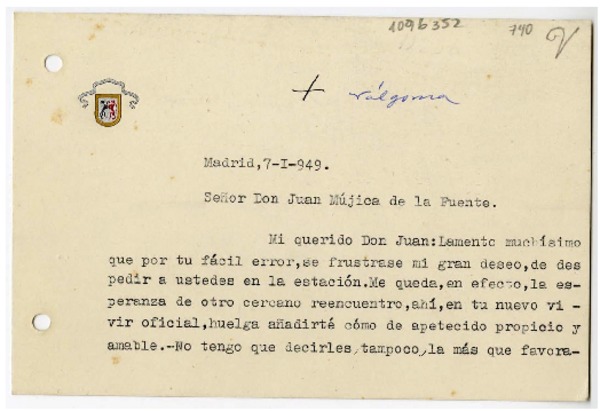 [Tarjeta] 1949 enero 7, Madrid, España [a] Juan Mujica de la Fuente [manuscrito] Dalmiro de la Válgoma y Díaz Varela.