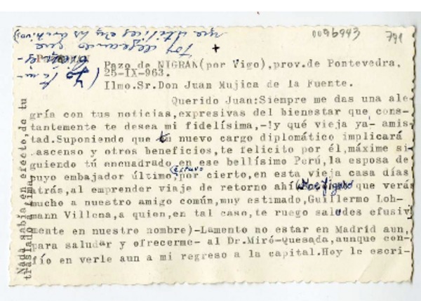 [Tarjeta postal] 1949 junio 9, Madrid, España [a] Juan Mujica de la Fuente [manuscrito] Joaquín de Entrambasaguas Peña.