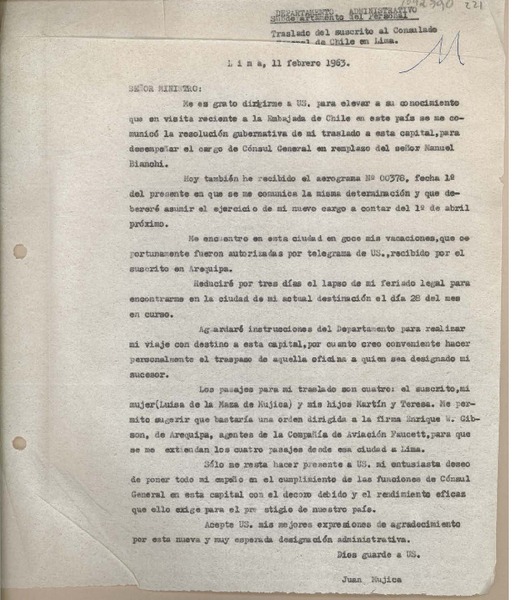 [Oficio consular N°221] 1964 octubre 8, Lima, Perú [al] Embajador de Chile en Lima, Perú [manuscrito] Juan Mujica de la Fuente.