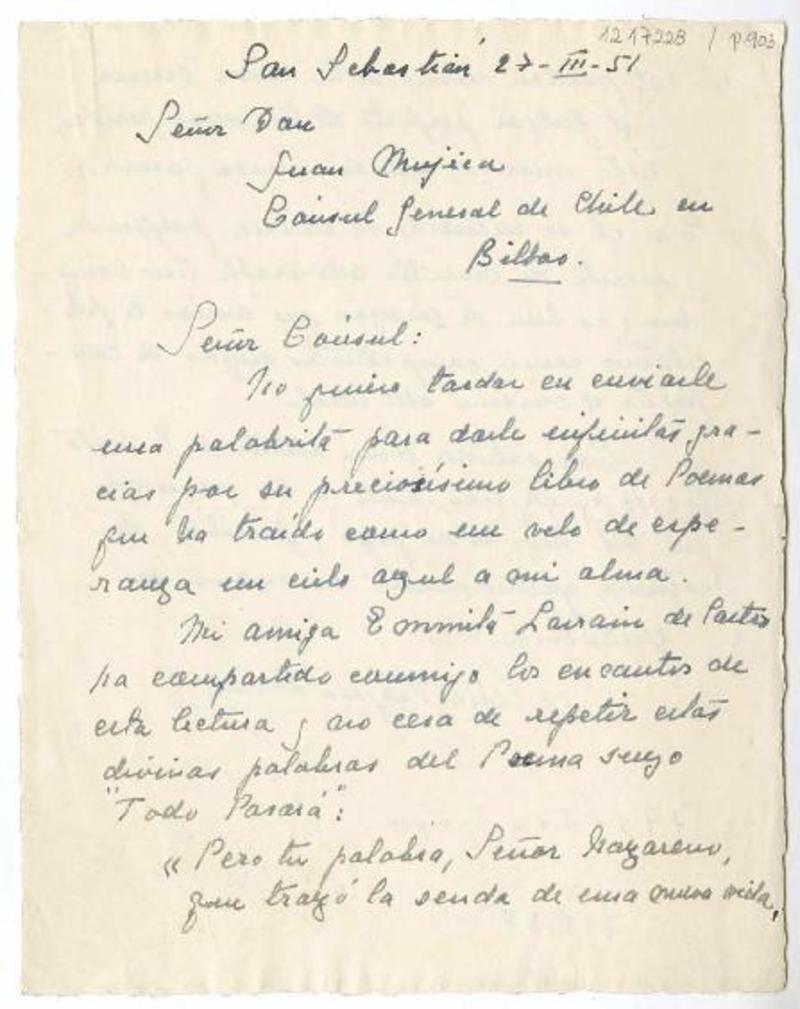 San Sebastián, Chile [a] Juan Mujica de la Fuente Carta, 1951 marzo 27, [manuscrito] Ana Vergara Bravo.