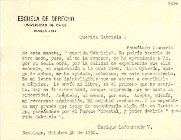 [Tarjeta] 1950 oct. 30, Santiago [a] Gabriela Mistral [manuscrito] Enrique Lafourcade V.