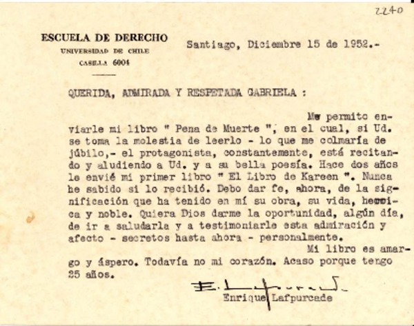 [Tarjeta] 1952 dic. 15, Santiago [a] Gabriela Mistral [manuscrito] Enrique Lafourcade.