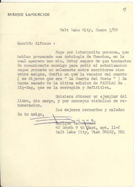 [Carta] 1970 diciembre 8, Santiago, Chile [a] Luis Oyarzún [manuscrito] Enrique Lafourcade.