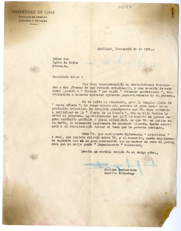 [carta] 1959 diciembre 24, Santiago, Chile [a] Pablo de Rokha [manuscrito] Enrique Lafourcade.