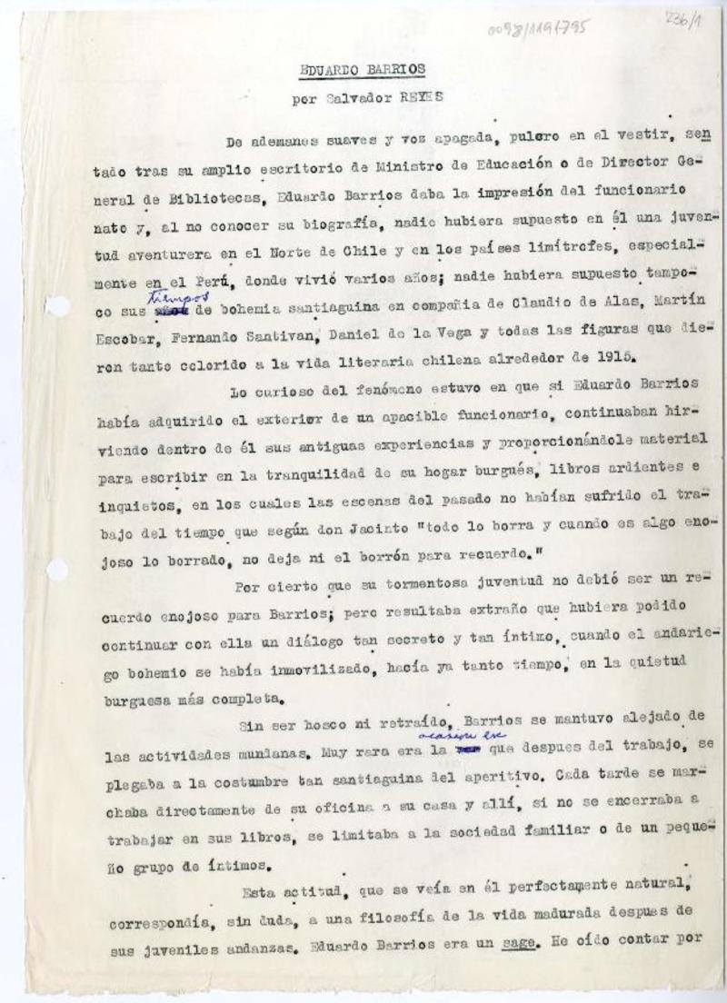Biografías - Autores chilenos - Reyes, Salvador - Barrios, Eduardo - Manuscritos chilenos
