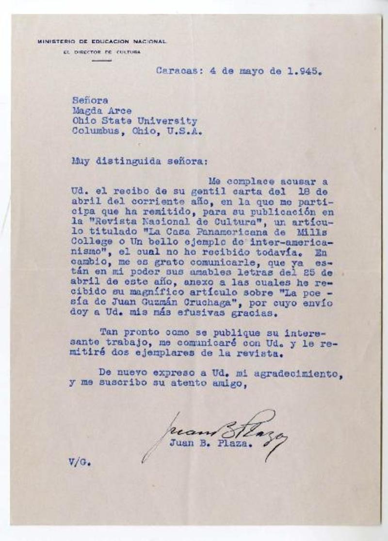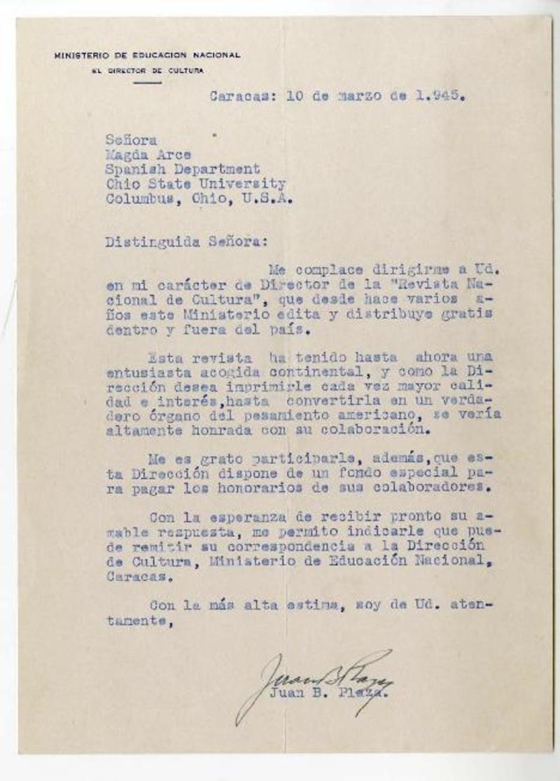 Caracas, Venezuela [a] Magda Arce, Ohio State University, Columbus, Ohio Carta, 1945 marzo 10, [manuscrito] Juan Bautista Plaza.