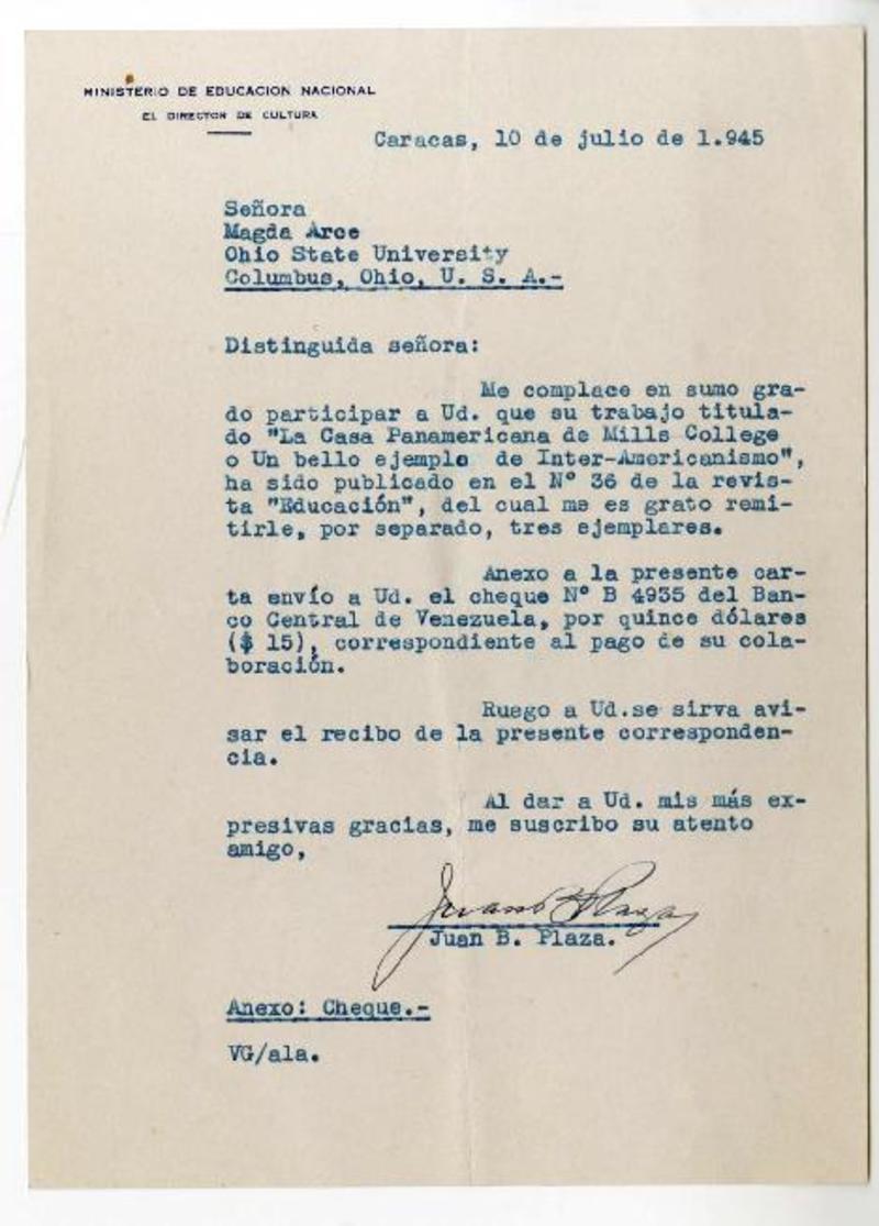 Caracas, Venezuela [a] Magda Arce, Ohio State University, Columbus, Ohio Carta, 1945 julio 10, [manuscrito] Juan Bautista Plaza.