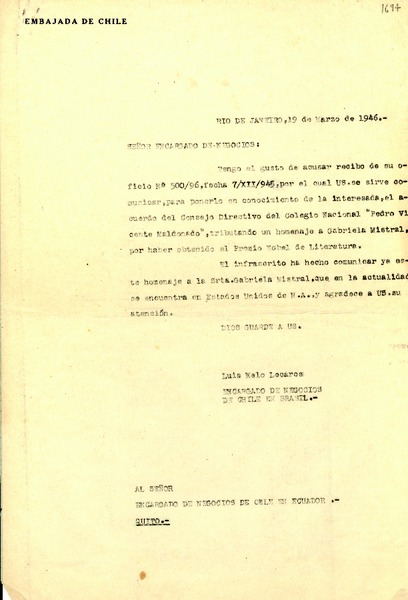 [Carta] 1946 mar. 19, Río de Janeiro, [Brasil] [al] Encargado de Negocios de Chile en Ecuador, Quito, Ecuador [manuscrito] Luis Melo Lecaros.