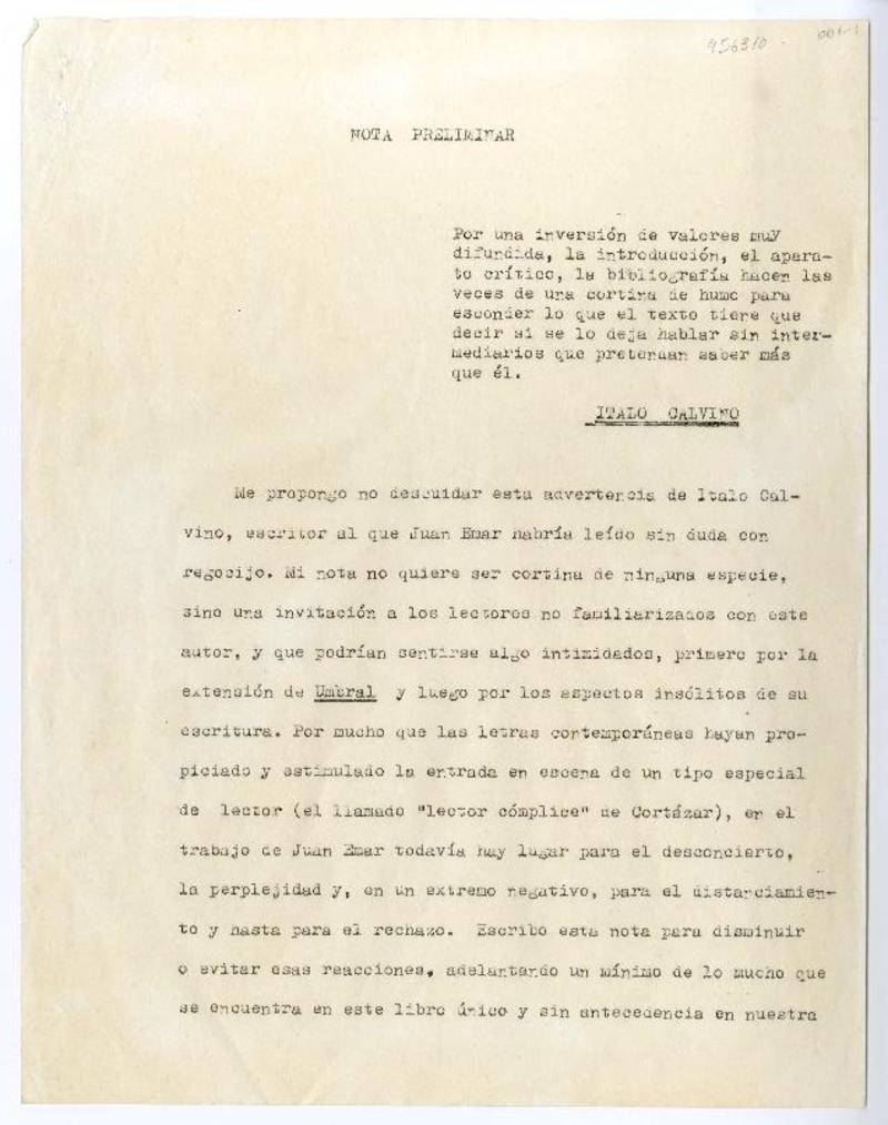 Nota Preliminar [manuscrito] Pedro Lastra.