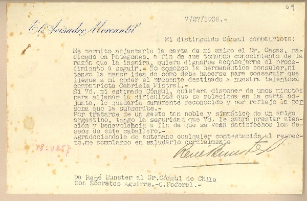 [Carta] 1938 mayo 27, [Argentina] [al] Sr. Cónsul de Chile, Don Sócrates Aguirre, C. Federal, [Argentina] [manuscrito] René Bunster.
