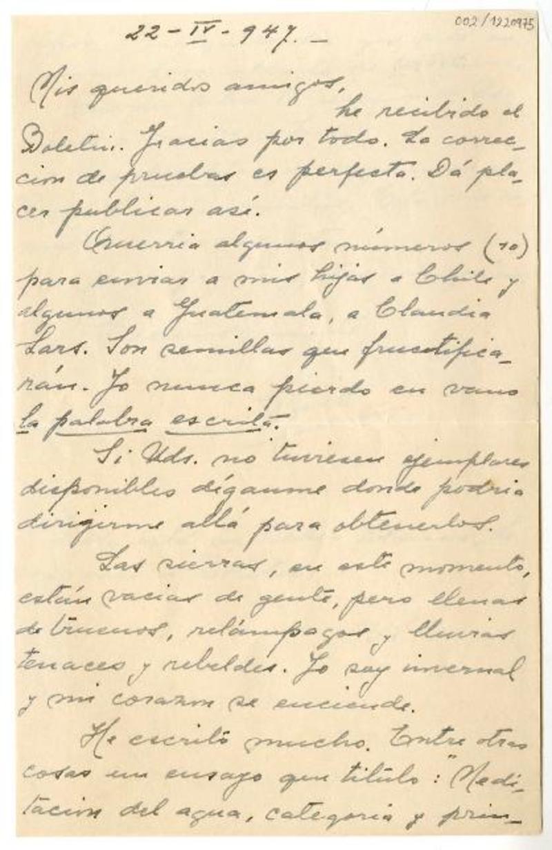 Buenos Aires, Argentina [a] Virginia Picot, Ricardo Montes i Bradley Carta, 1947 mayo 22, [manuscrito] Winnét de Rokha.