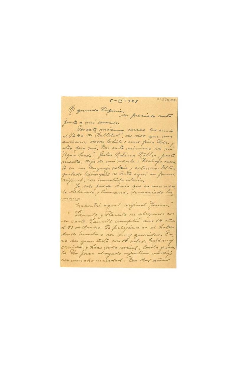 Rosario, Argentina [a] Virginia Picot Carta, 1947 abri 5, [manuscrito] Winnét de Rokha.