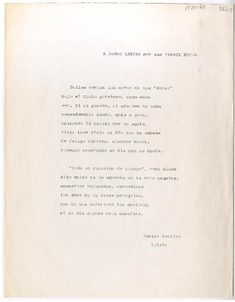 España [a] Pedro Lastra Tarjeta, 5 de mayo 1994, [manuscrito] Javier Lentini Marugan.