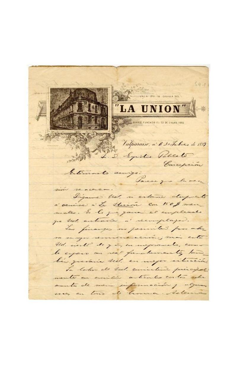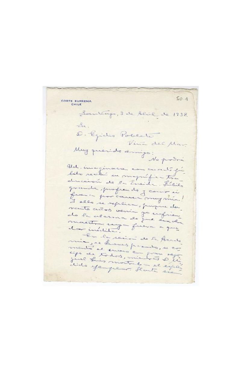 Santiago, Chile [a] Egidio Poblete, Valparaíso, Chile Carta, 1938 abril 3, [manuscrito] Roberto Peragallo Silva.