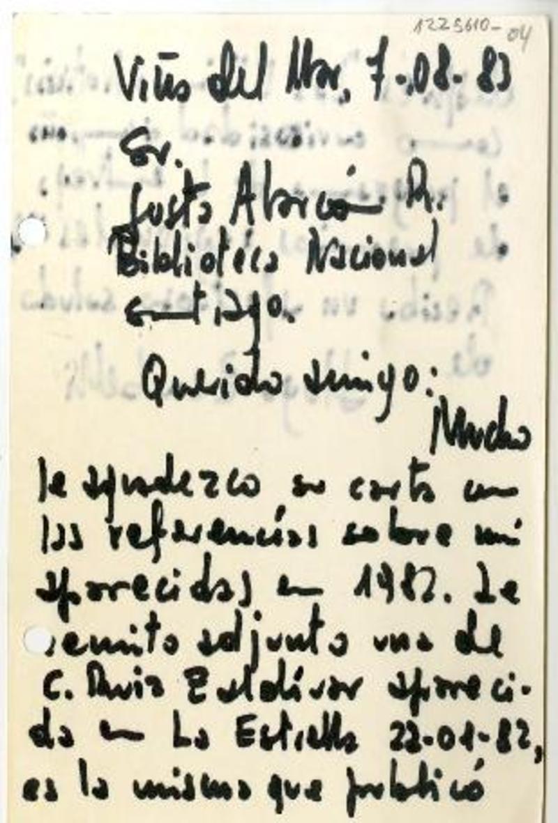 Viña del Mar, Valparaíso [a] Justo Alarcón Tarjeta, 1982 enero 4, [manuscrito] Hugo Zambelli.