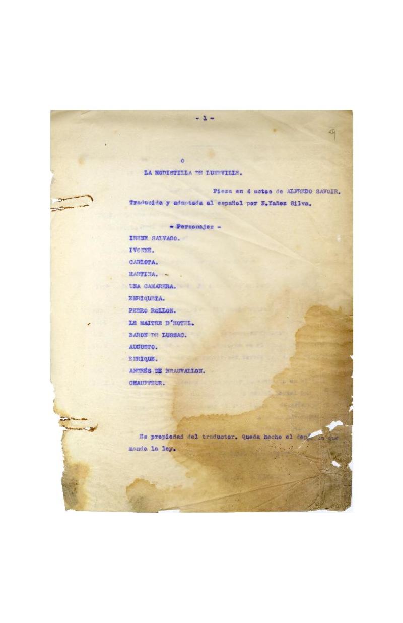 La modistilla de Lunéville [manuscrito] Alfred Savoir; traducida y adaptada al español por Nathanael Yáñez Silva.
