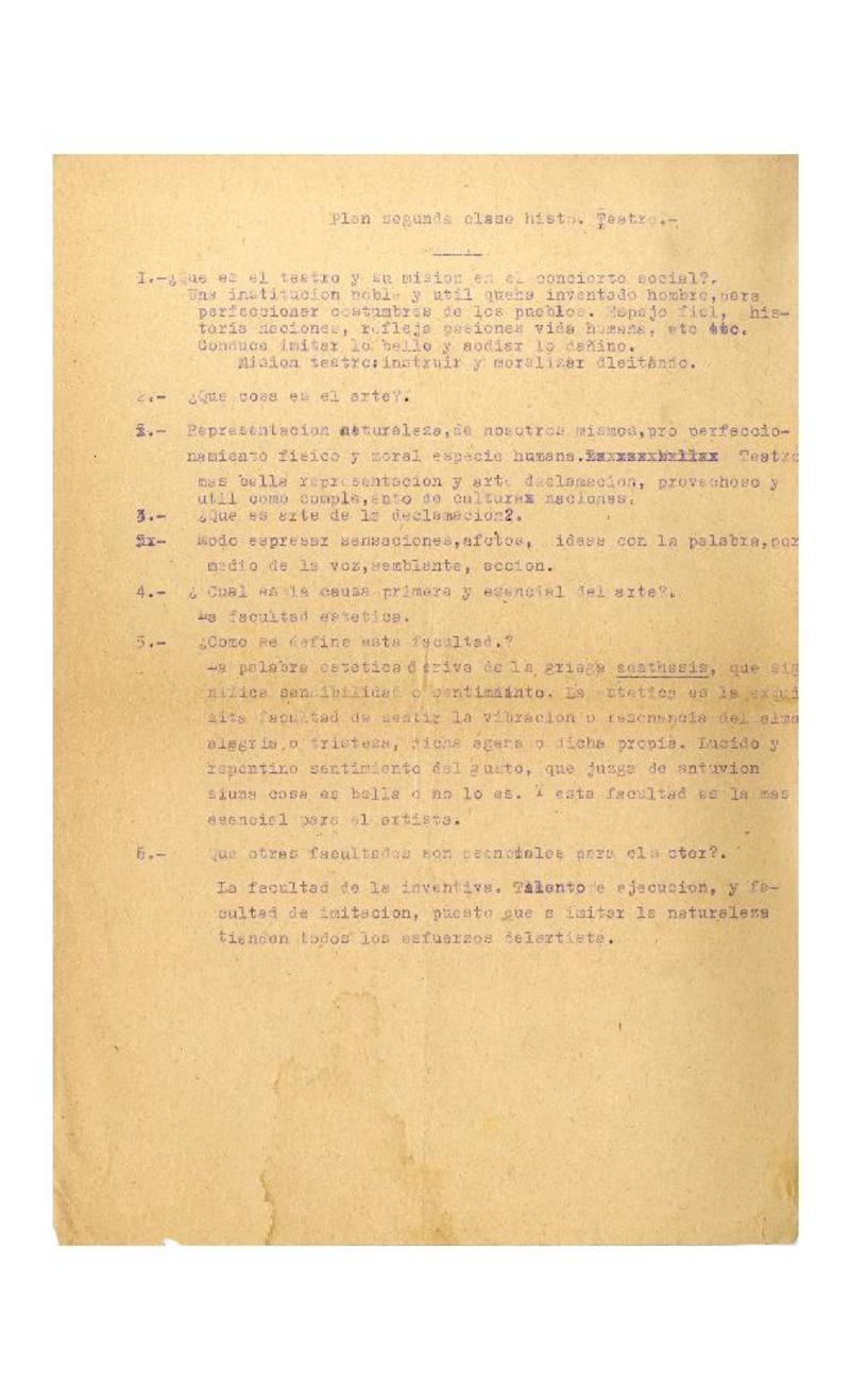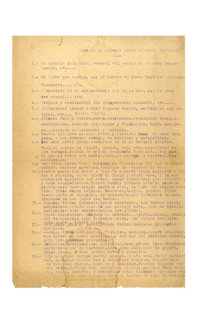 Plan de la primera clase de historia del teatro [manuscrito] Nathanael Yáñez Silva.