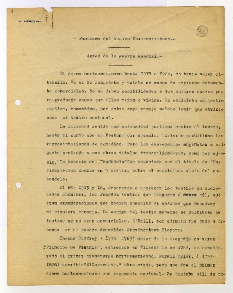 [Panorama del teatro norteamericano...] [manuscrito] Nathanael Yáñez Silva.