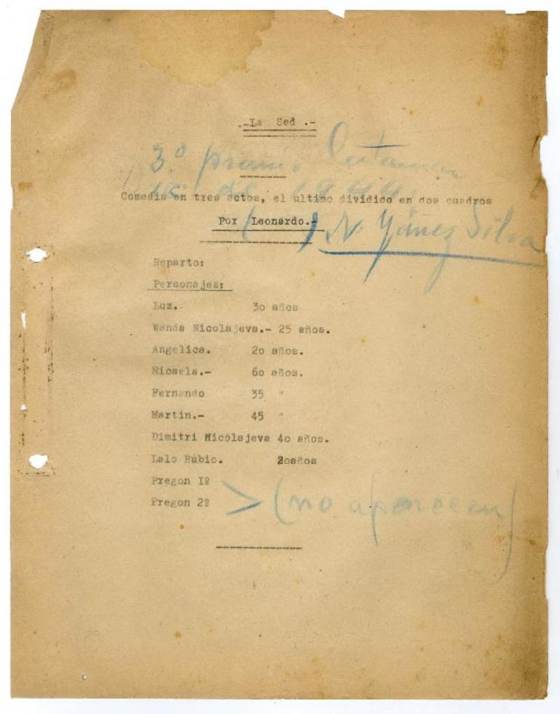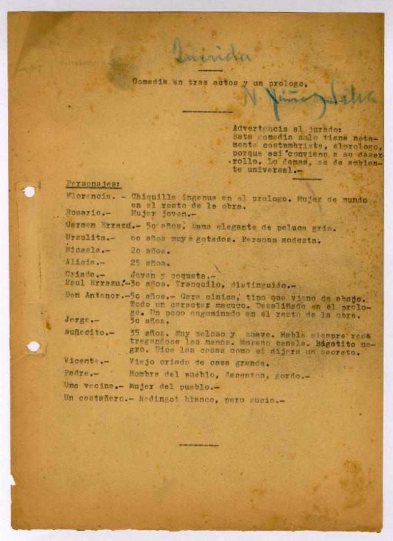 Comedia en tres actos y en prosa [manuscrito] Nathanael Yáñez Silva.