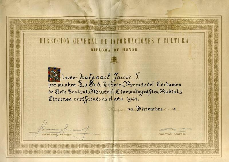 Santiago, Chile [a] Nathanael Yáñez Silva Diploma, 1944 diciembre 14, [manuscrito] Dirección General de Informaciones y Cultura (Chile).