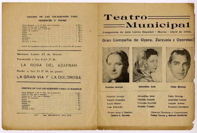 Temporada de arte lírico español : Teatro Municipal : marzo-abril de 1944 : Gran Compañia de Opera, Zarzuela y Opereta.