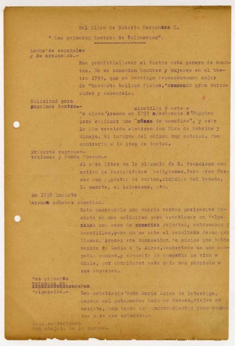 Los primeros teatros de Valparaíso [manuscrito] Roberto Hernández.